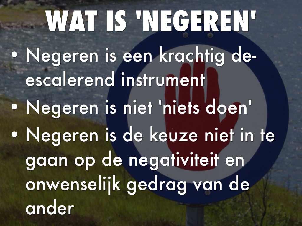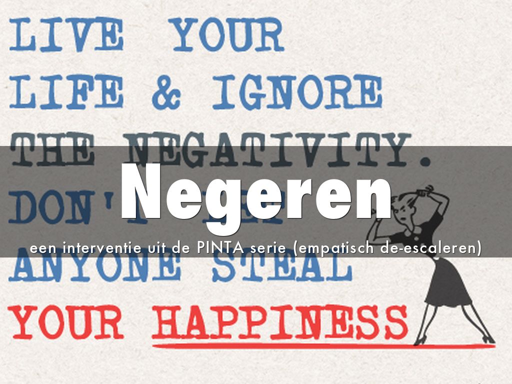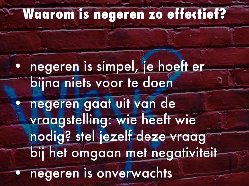 Het is oneerlijk om het slechte nieuws onder een vergroot glas te leggen en al het goede nieuws eromheen te negeren of bagatelliseren maar soms kan de zorgvrager niet anders dan zich overgeven aan negativiteit. Ik kan wel hele boeken schrijven over de keren dat ik negativiteit van een zorgvrager tegenkwam. Vaak wilde de ander enkel zijn verhaal kwijt en dat mag, maar zodra hij negativiteit gaat gebruiken om aandacht voor zichzelf op te eisen ten koste van anderen, ben ik weg. De zogenaamde bommetjes die gelegd worden, de onderhuidse opmerkingen om de sfeer neer te sabelen, de woorden die uitgesproken worden om anderen uit te dagen en een confrontatie uit te lokken, voor al deze situaties kan negeren een zeer goede eerste poging zijn om de sfeer te herstellen. Bedenk iedere keer dat de ander je uitdaagt of je er wel baat bij heb om uitgedaagd te worden. Wie heeft wie nodig bij een poging tot confronteren.