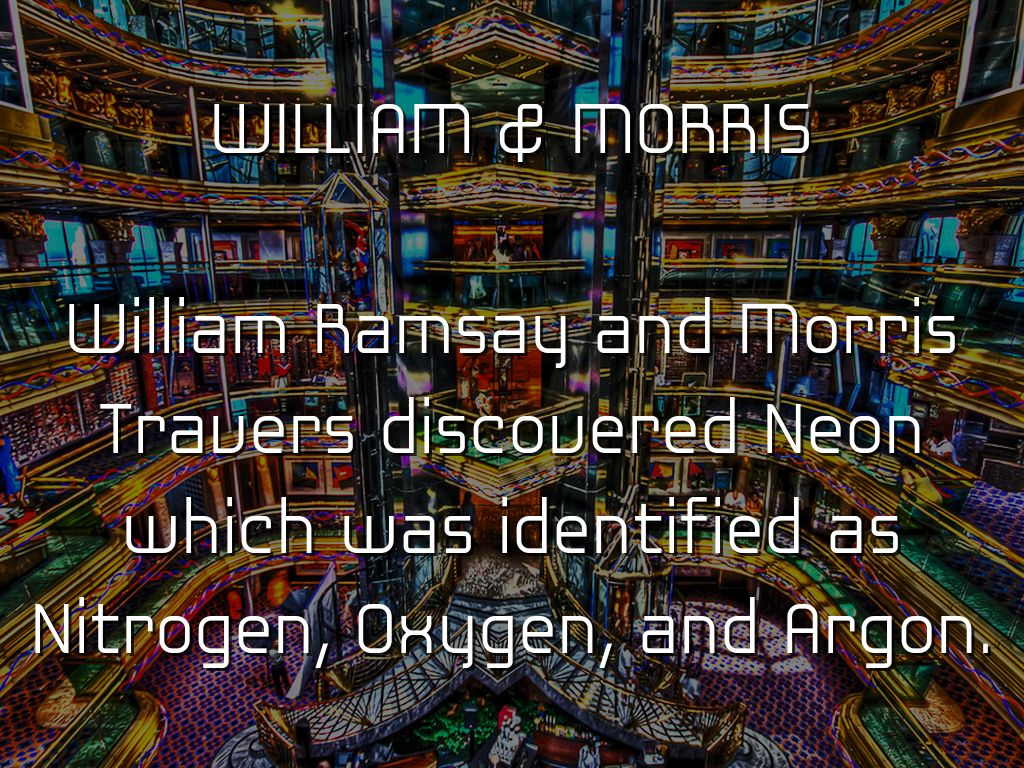 William Ramsay and Morris Travers discovered Neon which was identified as Nitrogen, Oxygen, and Argon.