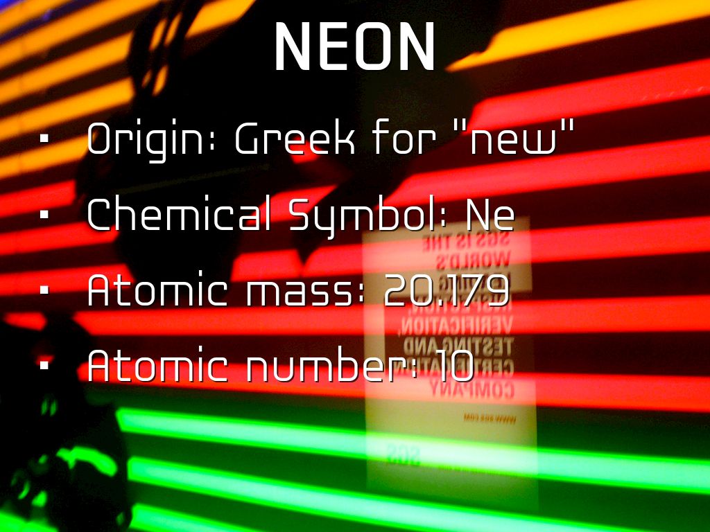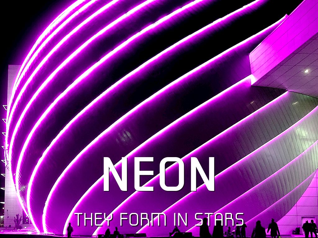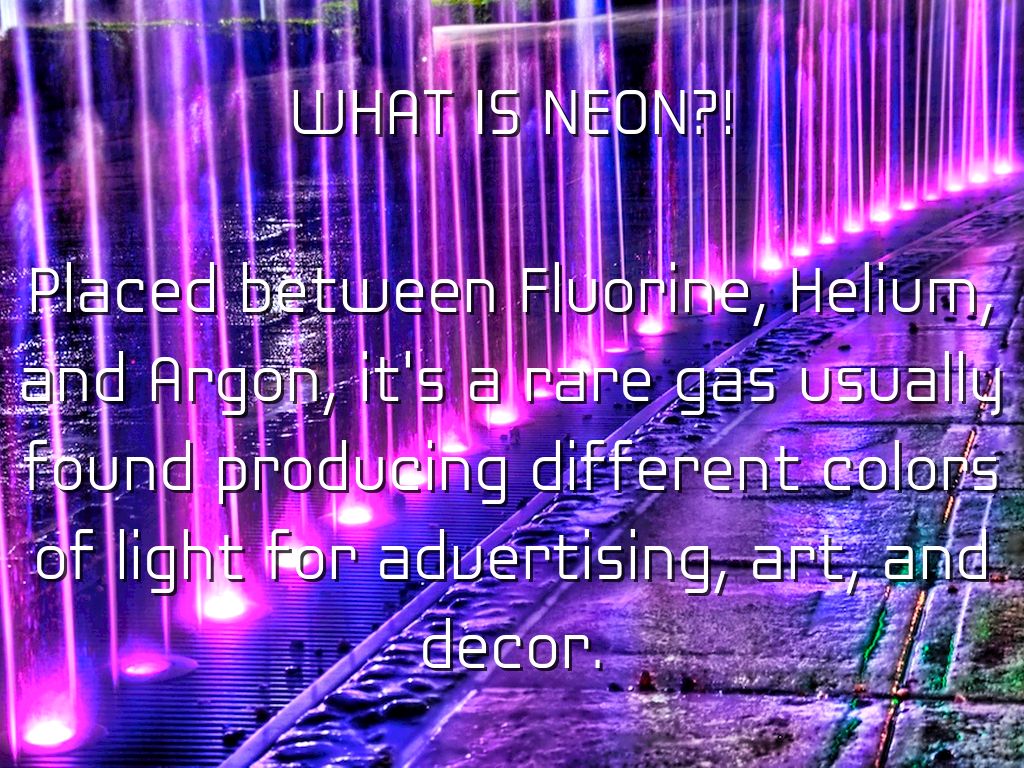 Placed between Fluorine, Helium, and Argon, it's a rare gas usually found producing different colors of light for advertising, art, and decor.
