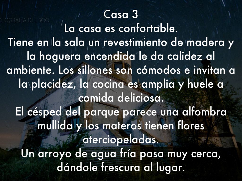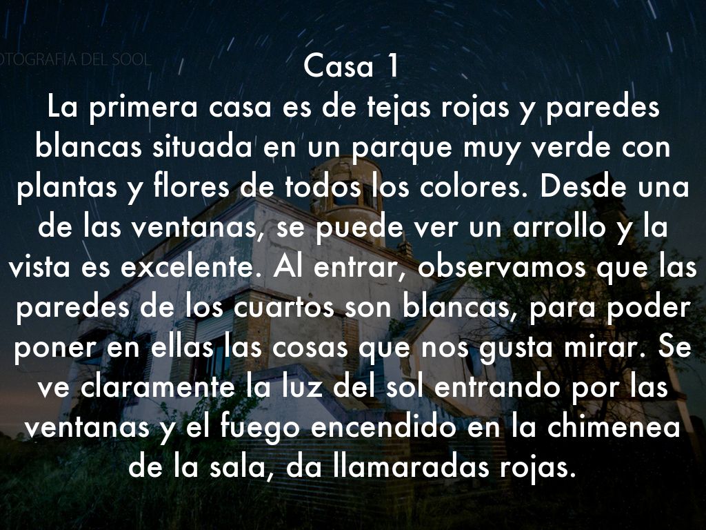 Casa 1 La primera casa es de tejas rojas y paredes blancas situada en un parque muy verde con plantas y flores de todos los colores. Desde una de las ventanas, se puede ver un arrollo y la vista es excelente. Al entrar, observamos que las paredes de los cuartos son blancas, para poder poner en ellas las cosas que nos gusta mirar. Se ve claramente la luz del sol entrando por las ventanas y el fuego encendido en la chimenea de la sala, da llamaradas rojas.