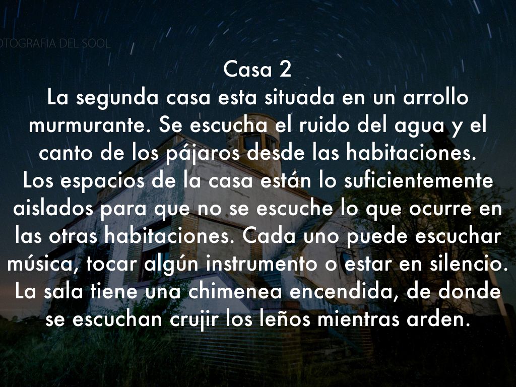 Casa 2 La segunda casa esta situada en un arrollo murmurante. Se escucha el ruido del agua y el canto de los pájaros desde las habitaciones. Los espacios de la casa están lo suficientemente aislados para que no se escuche lo que ocurre en las otras habitaciones. Cada uno puede escuchar música, tocar algún instrumento o estar en silencio. La sala tiene una chimenea encendida, de donde se escuchan crujir los leños mientras arden.