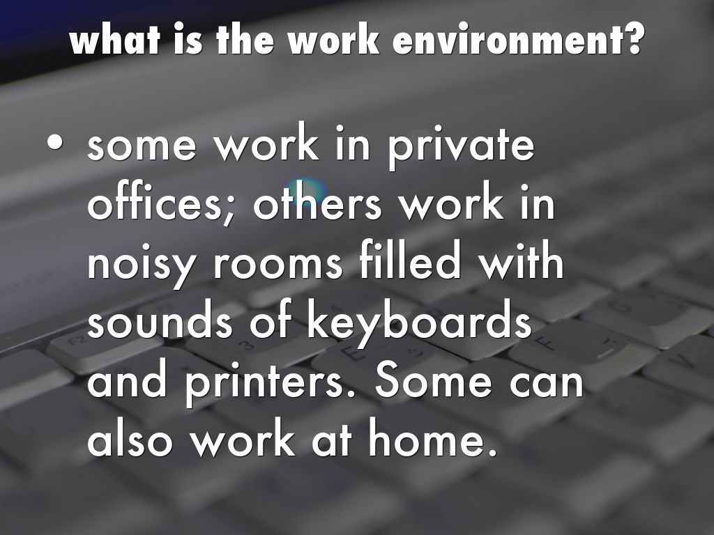 some work in private offices; others work in noisy rooms filled with sounds of keyboards and printers. Some can also work at home.