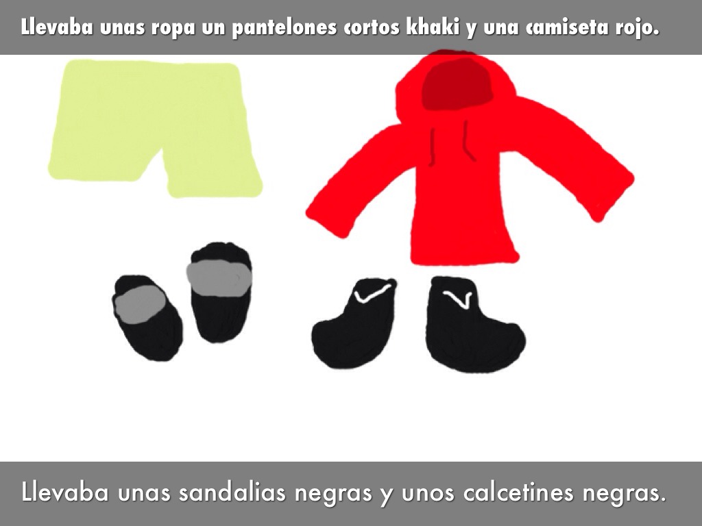 Llevaba unas ropa un pantelones cortos khaki y una camiseta rojo.