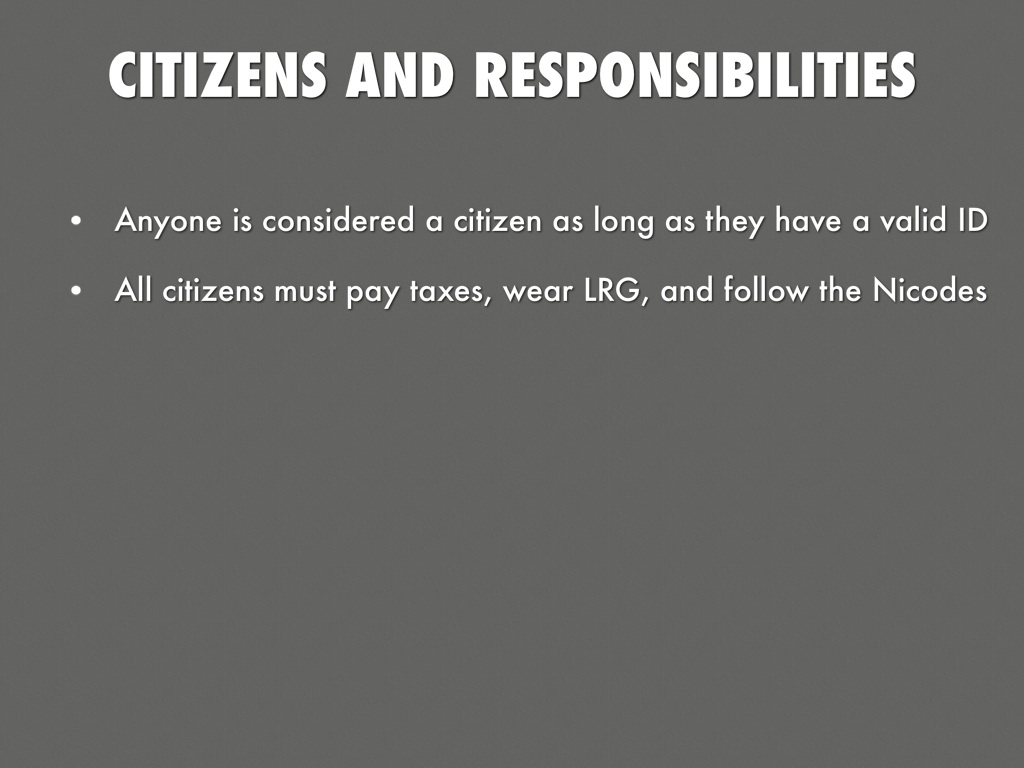 All citizens must pay taxes, wear LRG, and follow the Nicodes