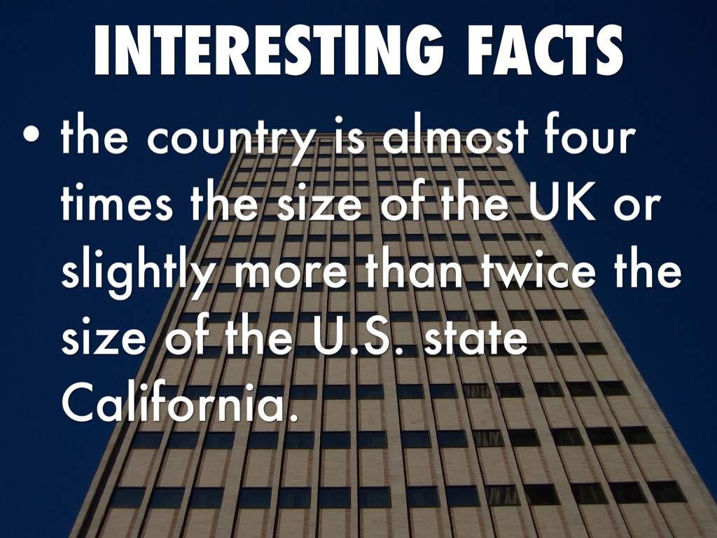 • the country is almost four times the size of the UK or slightly more than twice the size of the U.S. state California.