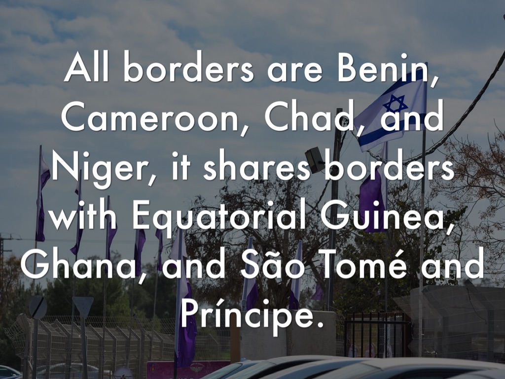 All borders are Benin, Cameroon, Chad, and Niger, it shares borders with Equatorial Guinea, Ghana, and São Tomé and Príncipe.