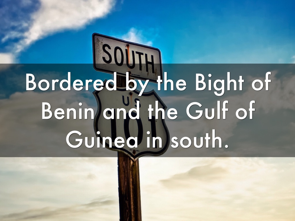 Bordered by the Bight of Benin and the Gulf of Guinea in south.