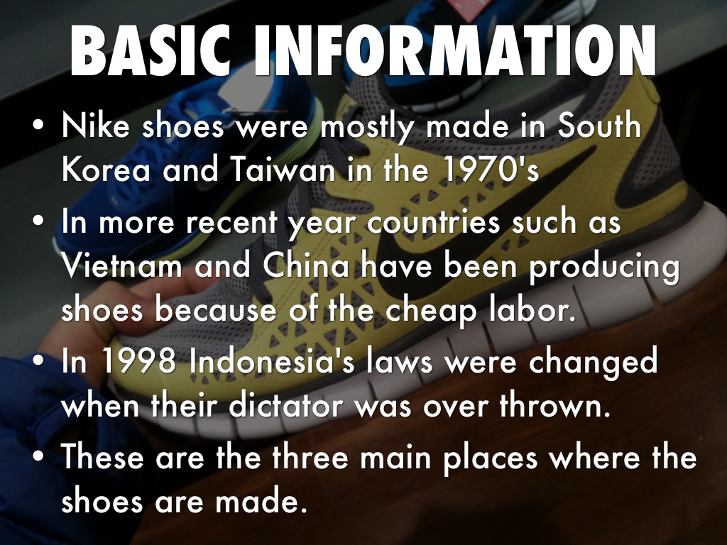 In more recent year countries such as Vietnam and China have been producing shoes because of the cheap labor.