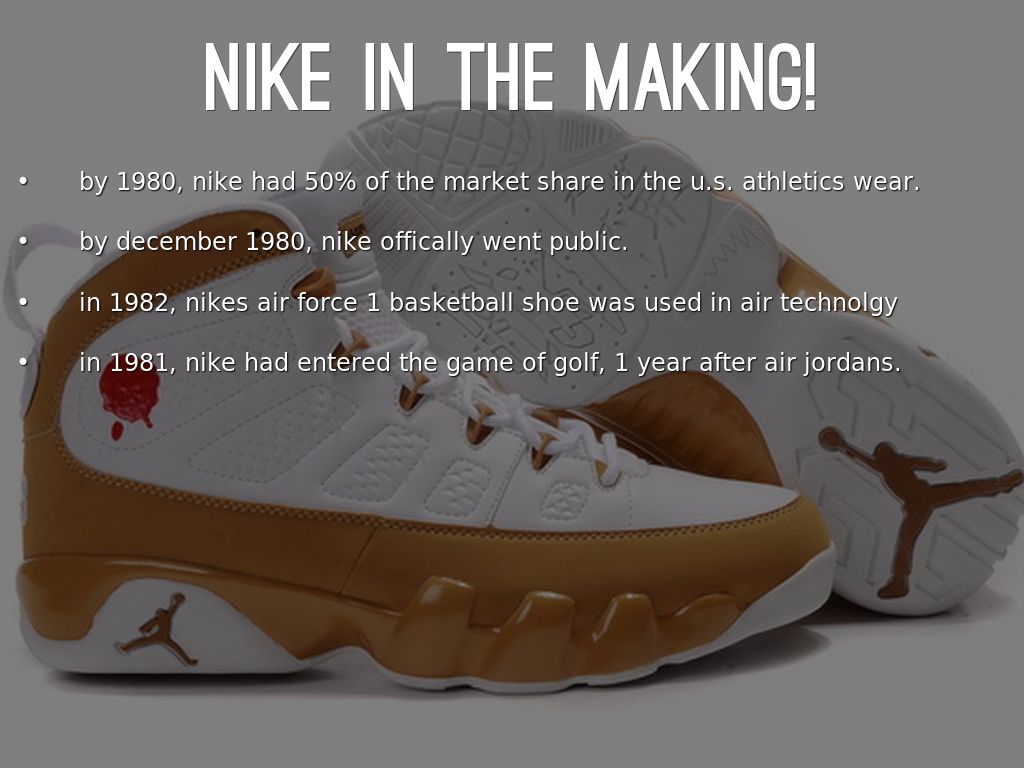 by 1980, nike had 50% of the market share in the u.s. athletics wear.