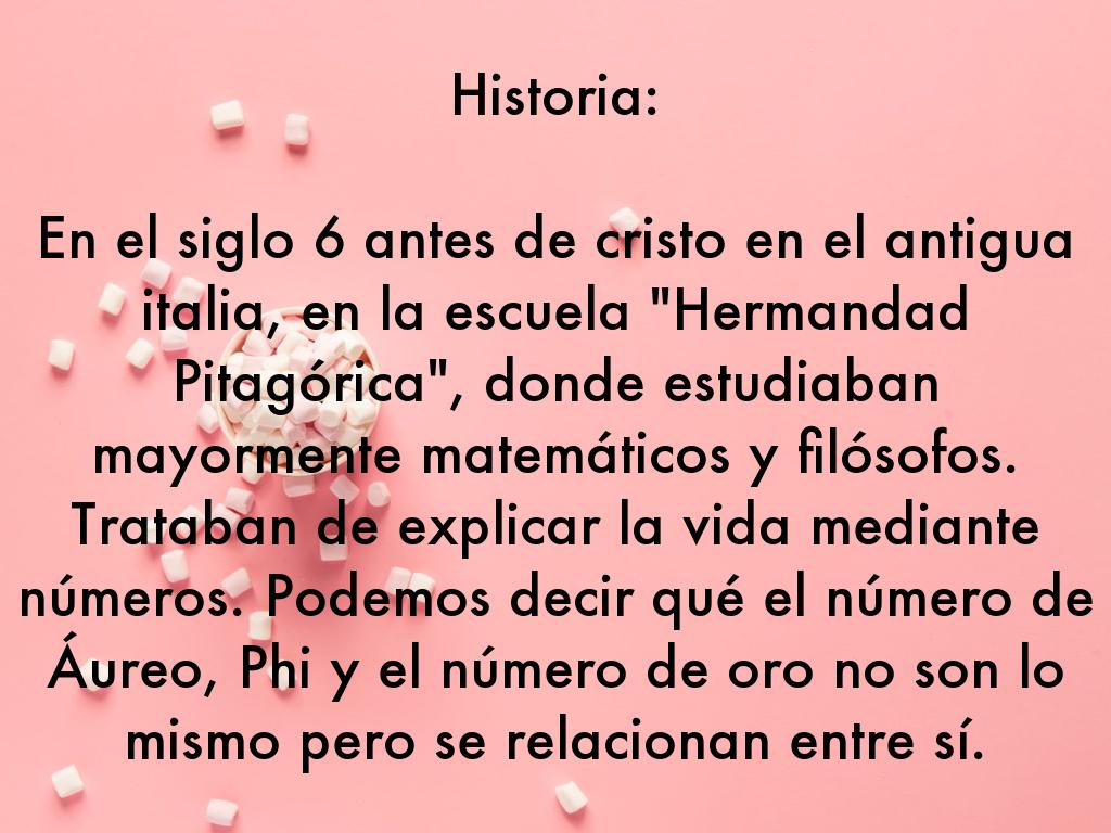 En el siglo 6 antes de cristo en el antigua italia, en la escuela "Hermandad Pitagórica", donde estudiaban mayormente matemáticos y filósofos. Trataban de explicar la vida mediante números. Podemos decir qué el número de Áureo, Phi y el número de oro no son lo mismo pero se relacionan entre sí.