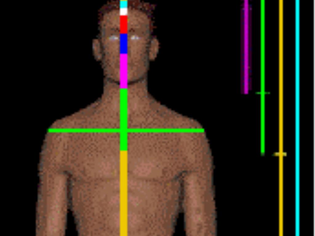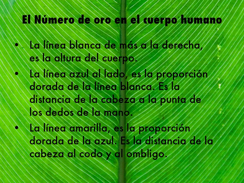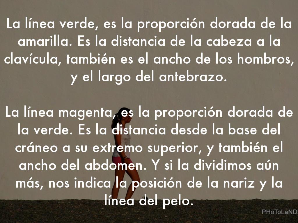 La línea verde, es la proporción dorada de la amarilla. Es la distancia de la cabeza a la clavícula, también es el ancho de los hombros, y el largo del antebrazo.