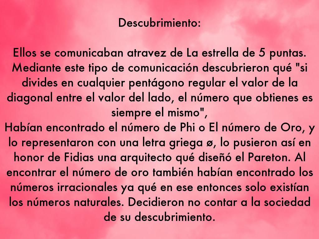 Ellos se comunicaban atravez de La estrella de 5 puntas. Mediante este tipo de comunicación descubrieron qué "si divides en cualquier pentágono regular el valor de la diagonal entre el valor del lado, el número que obtienes es siempre el mismo", Habían encontrado el número de Phi o El número de Oro, y lo representaron con una letra griega ø, lo pusieron así en honor de Fidias una arquitecto qué diseñó el Pareton. Al encontrar el número de oro también habían encontrado los números irracionales ya qué en ese entonces solo existían los números naturales. Decidieron no contar a la sociedad de su descubrimiento.