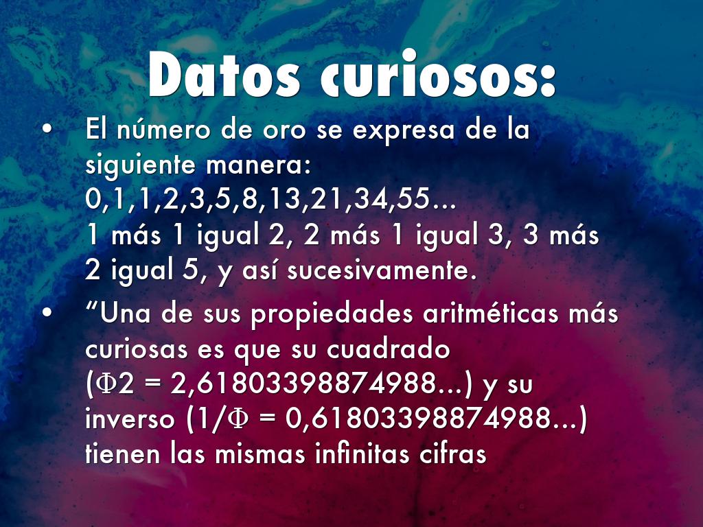 (Φ2 = 2,61803398874988…) y su inverso (1/Φ = 0,61803398874988…) tienen las mismas infinitas cifras decimales” (academiaplay.es).