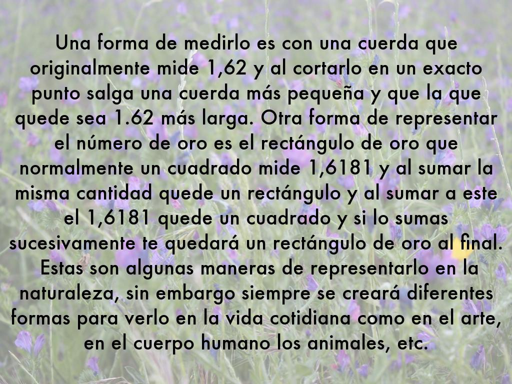 Una forma de medirlo es con una cuerda que originalmente mide 1,62 y al cortarlo en un exacto punto salga una cuerda más pequeña y que la que quede sea 1.62 más larga. Otra forma de representar el número de oro es el rectángulo de oro que normalmente un cuadrado mide 1,6181 y al sumar la misma cantidad quede un rectángulo y al sumar a este el 1,6181 quede un cuadrado y si lo sumas sucesivamente te quedará un rectángulo de oro al final. Estas son algunas maneras de representarlo en la naturaleza, sin embargo siempre se creará diferentes formas para verlo en la vida cotidiana como en el arte, en el cuerpo humano los animales, etc.