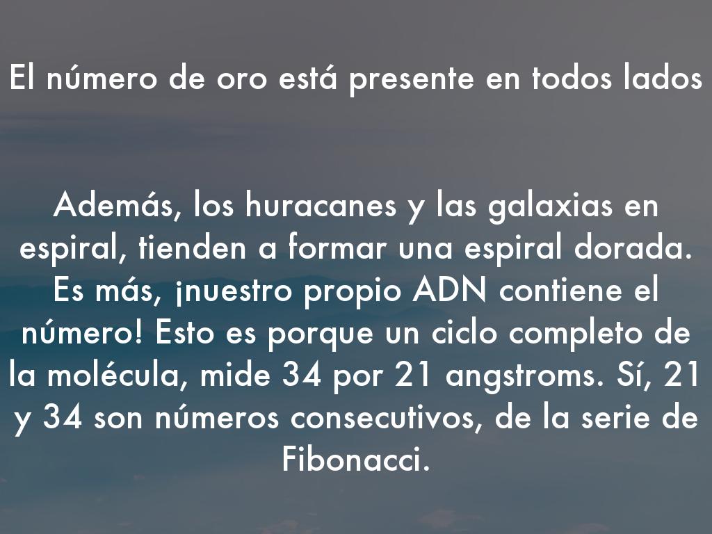Además, los huracanes y las galaxias en espiral, tienden a formar una espiral dorada. Es más, ¡nuestro propio ADN contiene el número! Esto es porque un ciclo completo de la molécula, mide 34 por 21 angstroms. Sí, 21 y 34 son números consecutivos, de la serie de Fibonacci.