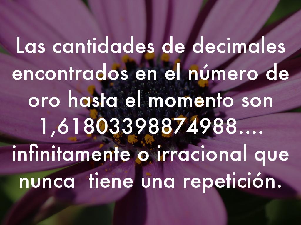 Las cantidades de decimales encontrados en el número de oro hasta el momento son 1,61803398874988…. infinitamente o irracional que nunca tiene una repetición.