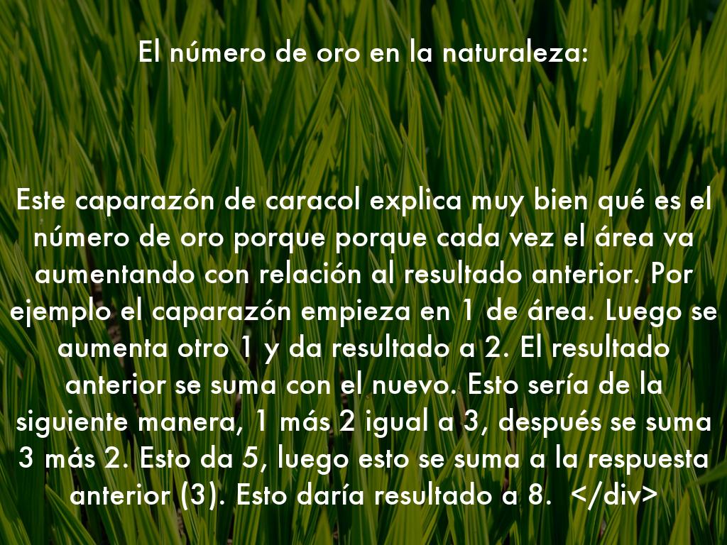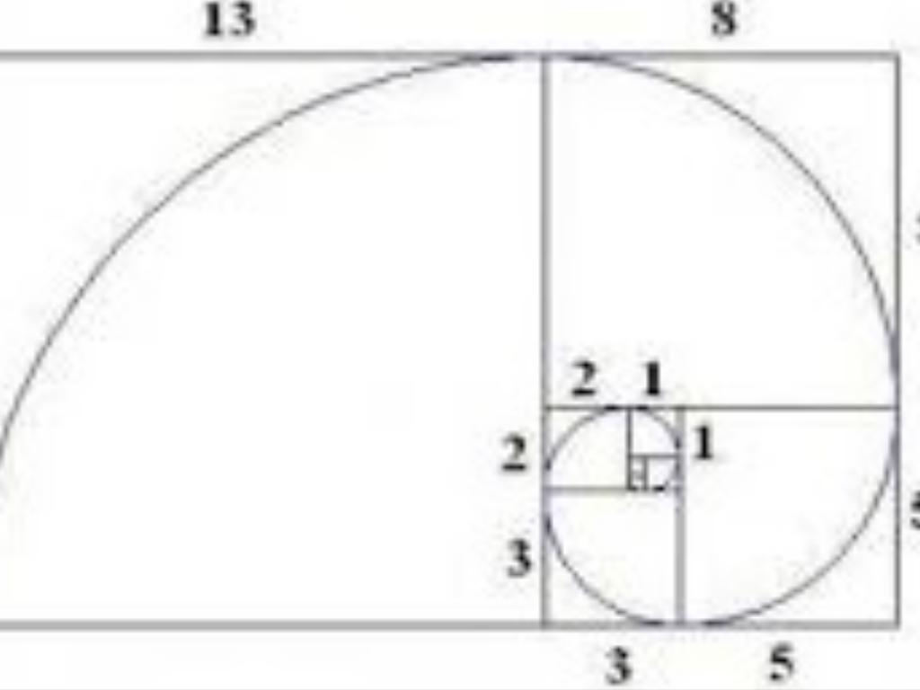 Este caparazón de caracol explica muy bien qué es el número de oro porque porque cada vez el área va aumentando con relación al resultado anterior. Por ejemplo el caparazón empieza en 1 de área. Luego se aumenta otro 1 y da resultado a 2. El resultado anterior se suma con el nuevo. Esto sería de la siguiente manera, 1 más 2 igual a 3, después se suma 3 más 2. Esto da 5, luego esto se suma a la respuesta anterior (3). Esto daría resultado a 8.
