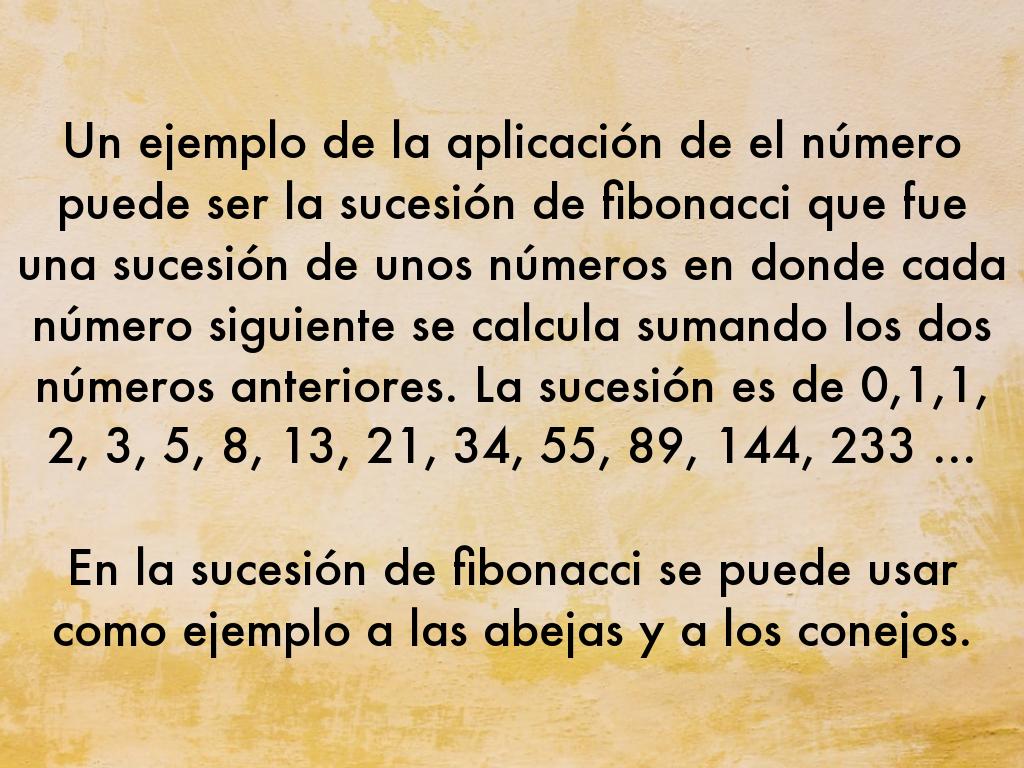 Un ejemplo de la aplicación de el número puede ser la sucesión de fibonacci que fue una sucesión de unos números en donde cada número siguiente se calcula sumando los dos números anteriores. La sucesión es de 0,1,1, 2, 3, 5, 8, 13, 21, 34, 55, 89, 144, 233 …