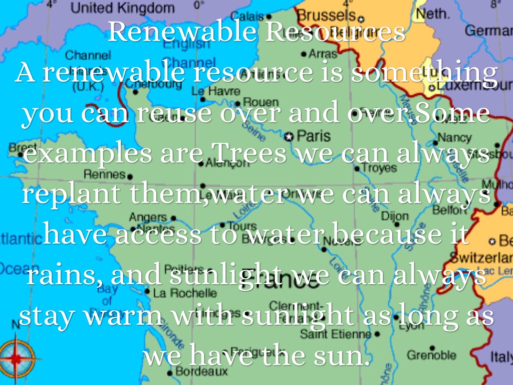 A renewable resource is something you can reuse over and over.Some examples are Trees we can always replant them,water we can always have access to water because it rains, and sunlight we can always stay warm with sunlight as long as we have the sun.