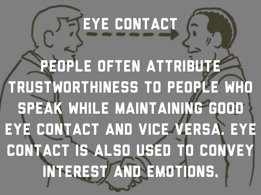 People often attribute trustworthiness to people who speak while maintaining good eye contact and vice versa. Eye contact is also used to convey interest and emotions,