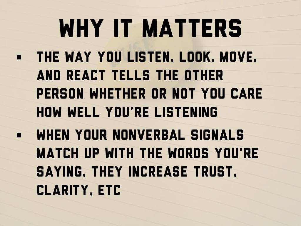 - When your nonverbal signals match up with the words you’re saying, they increase trust, clarity, etc