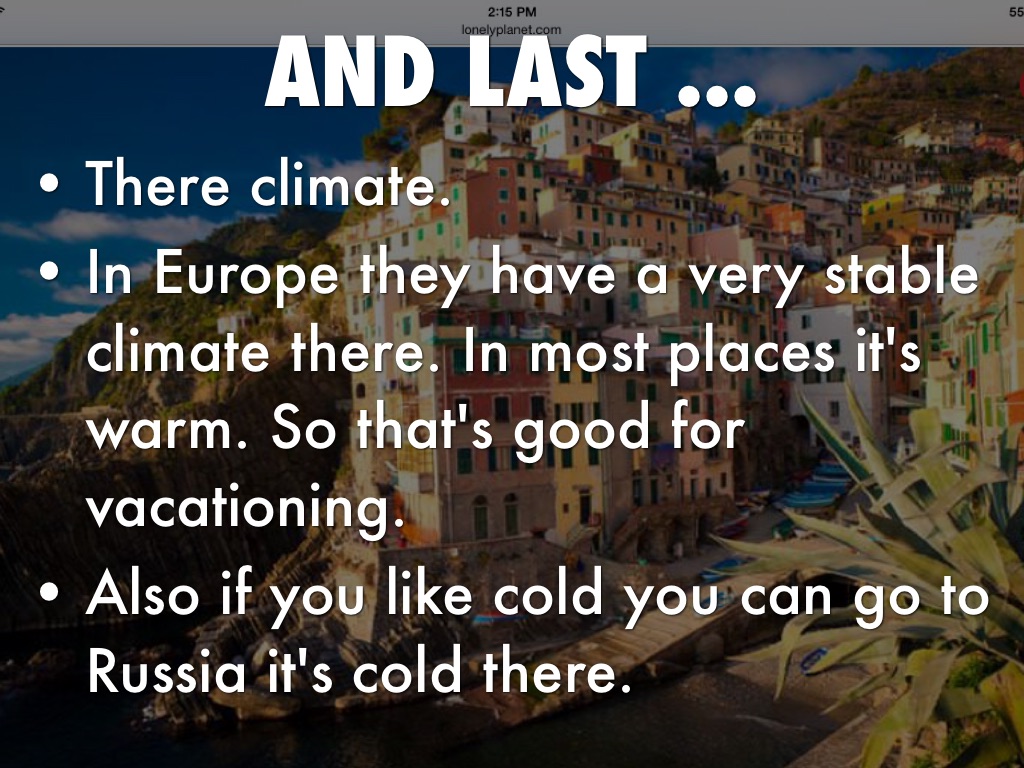 • In Europe they have a very stable climate there. In most places it's warm. So that's good for vacationing.