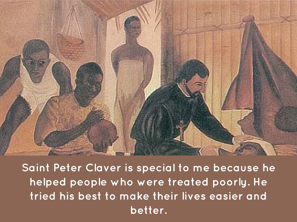 Saint Peter Claver is special to me because he helped people who were treated poorly. He tried his best to make their lives easier and better.