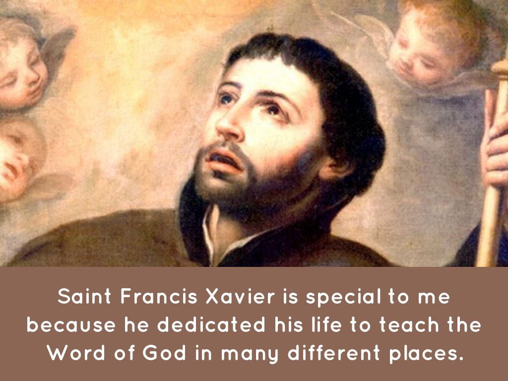 Saint Francis Xavier is special to me because he dedicated his life to teach the Word of God in many different places.
