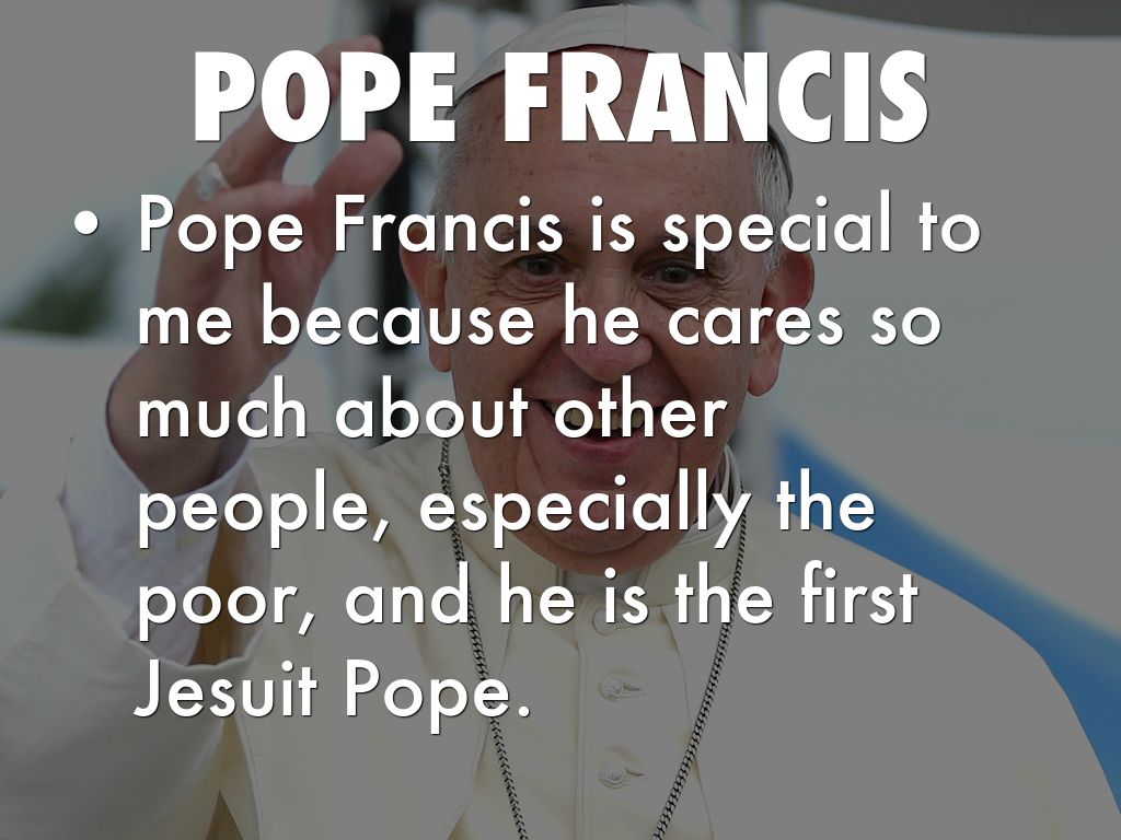 • Pope Francis is special to me because he cares so much about other people, especially the poor, and he is the first Jesuit Pope.