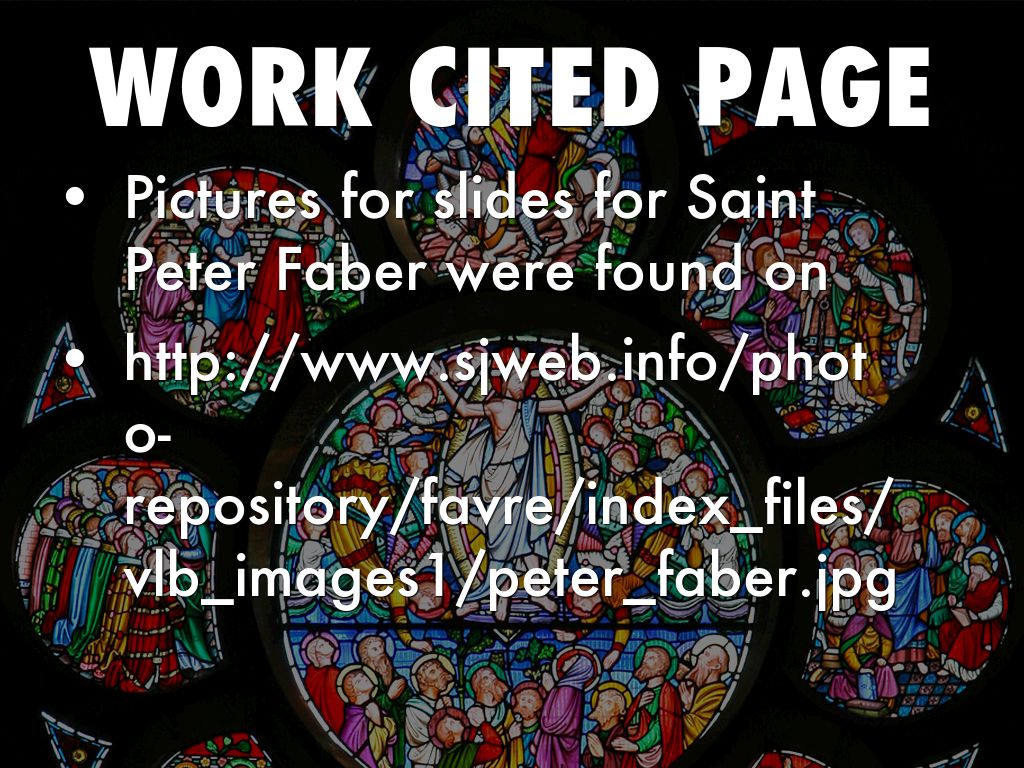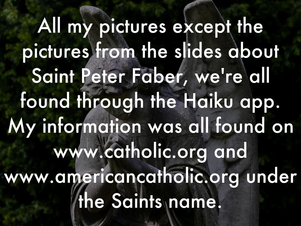 All my pictures except the pictures from the slides about Saint Peter Faber, we're all found through the Haiku app. My information was all found on www.catholic.org and www.americancatholic.org under the Saints name.