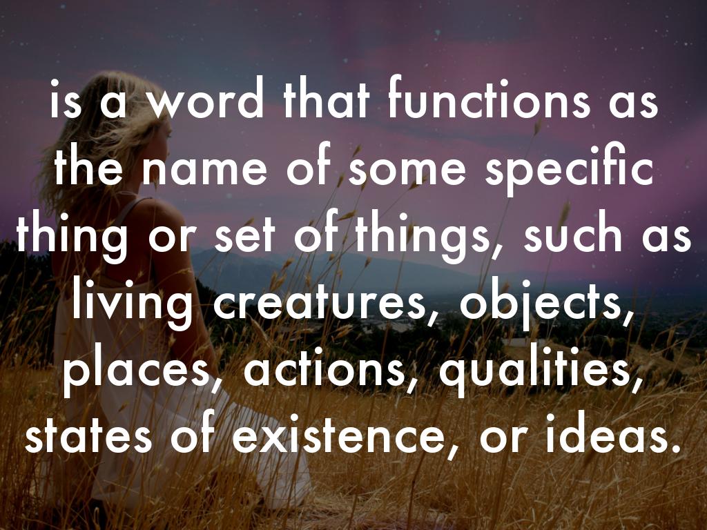 is a word that functions as the name of some specific thing or set of things, such as living creatures, objects, places, actions, qualities, states of existence, or ideas.