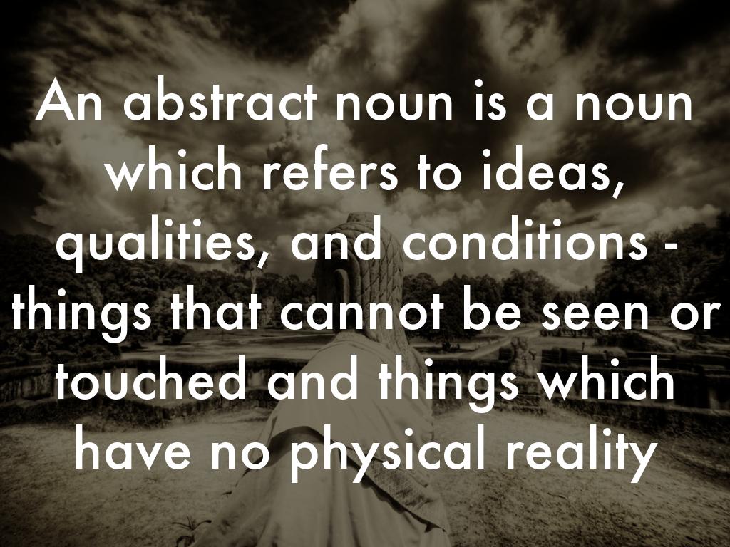 An abstract noun is a noun which refers to ideas, qualities, and conditions - things that cannot be seen or touched and things which have no physical reality