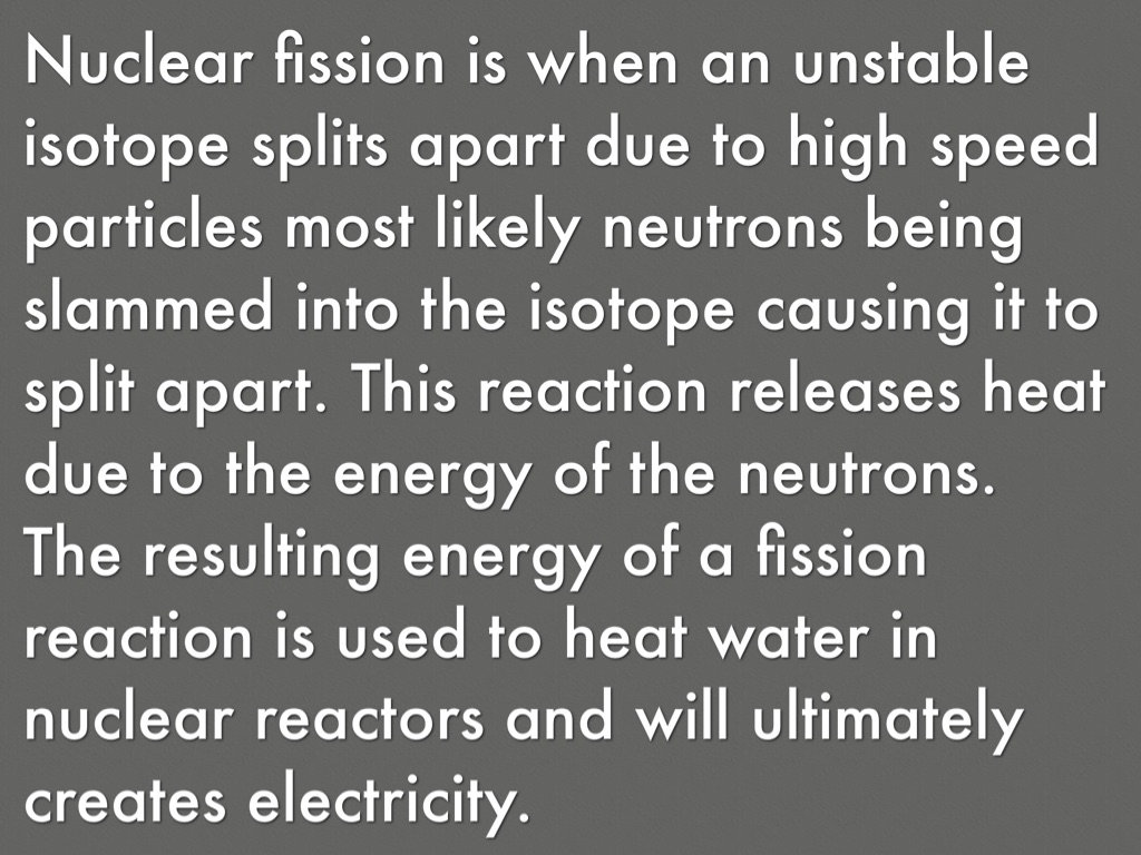 Nuclear fission is when an unstable isotope splits apart due to high speed particles most likely neutrons being slammed into the isotope causing it to split apart. This reaction releases heat due to the energy of the neutrons. The resulting energy of a fission reaction is used to heat water in nuclear reactors and will ultimately creates electricity.