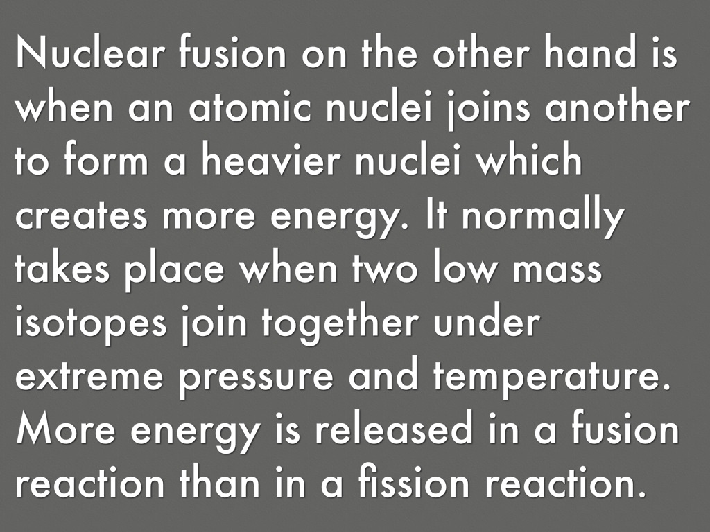 Nuclear fusion on the other hand is when an atomic nuclei joins another to form a heavier nuclei which creates more energy. It normally takes place when two low mass isotopes join together under extreme pressure and temperature. More energy is released in a fusion reaction than in a fission reaction.