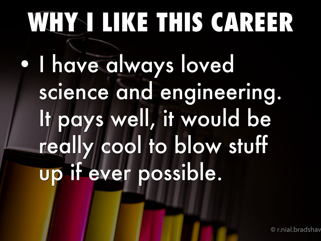 I have always loved science and engineering. It pays well, it would be really cool to blow stuff up if ever possible.