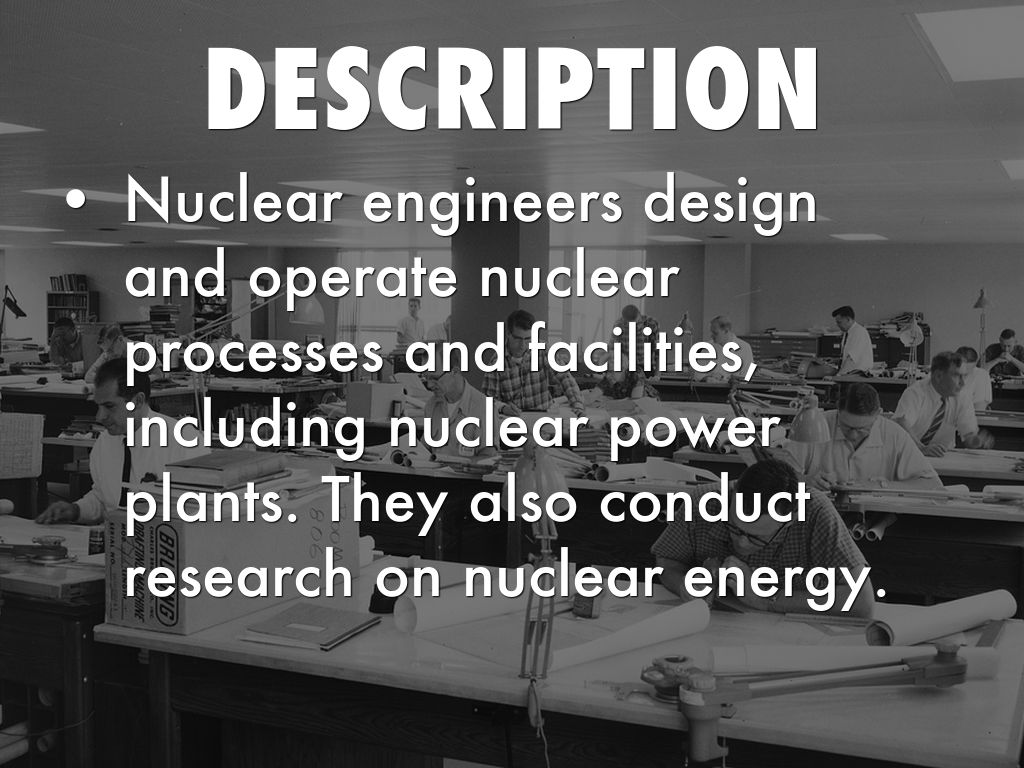 Nuclear engineers design and operate nuclear processes and facilities, including nuclear power plants. They also conduct research on nuclear energy.