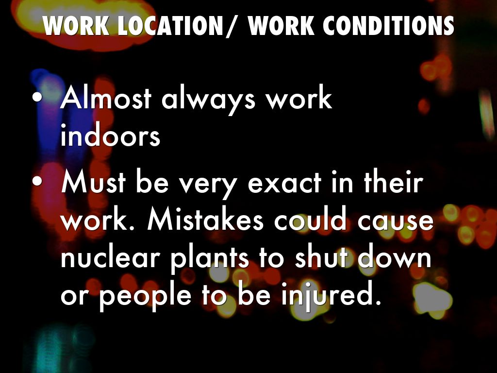 Must be very exact in their work. Mistakes could cause nuclear plants to shut down or people to be injured.