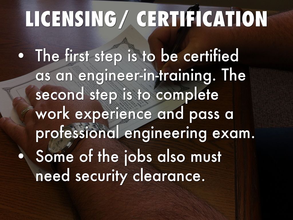 The first step is to be certified as an engineer-in-training. The second step is to complete work experience and pass a professional engineering exam.