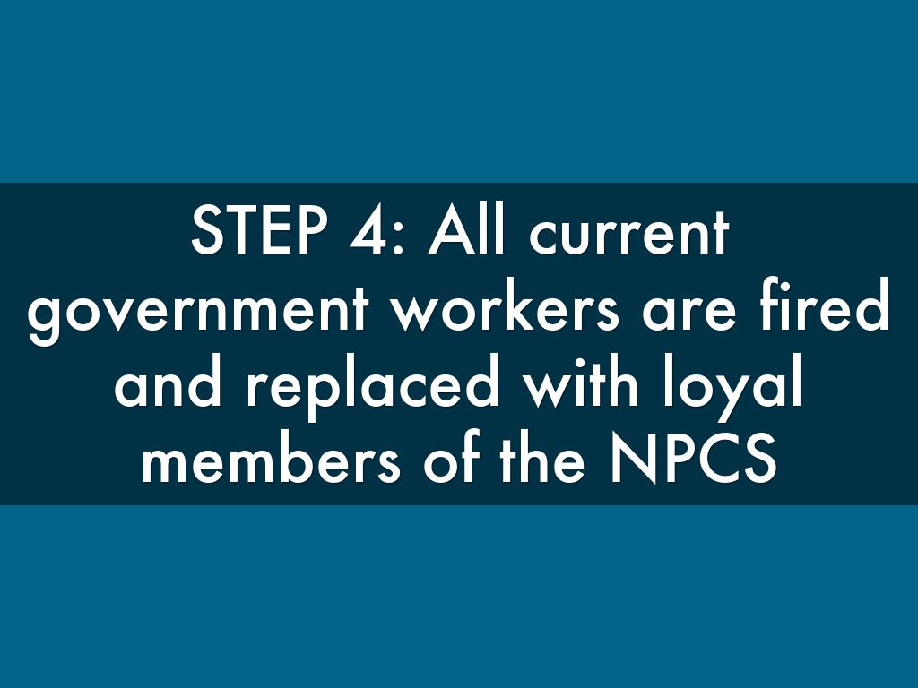 STEP 4: All current government workers are fired and replaced with loyal members of the NPCS