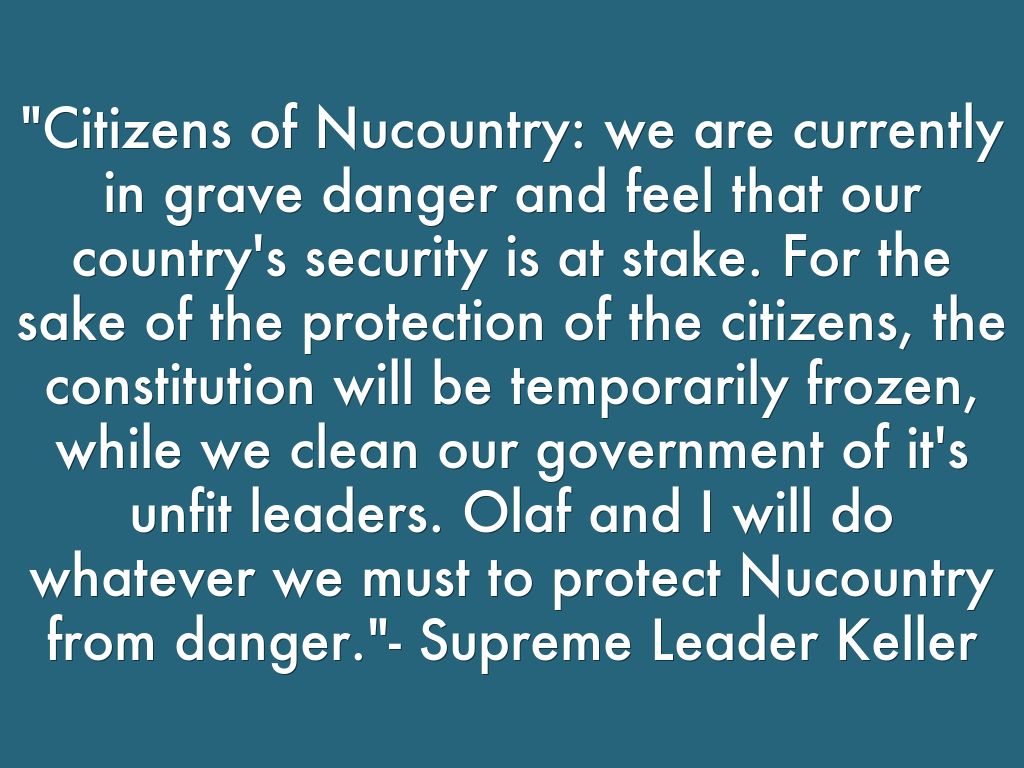 "Citizens of Nucountry: we are currently in grave danger and feel that our country's security is at stake. For the sake of the protection of the citizens, the constitution will be temporarily frozen, while we clean our government of it's unfit leaders. Olaf and I will do whatever we must to protect Nucountry from danger."- Supreme Leader Keller