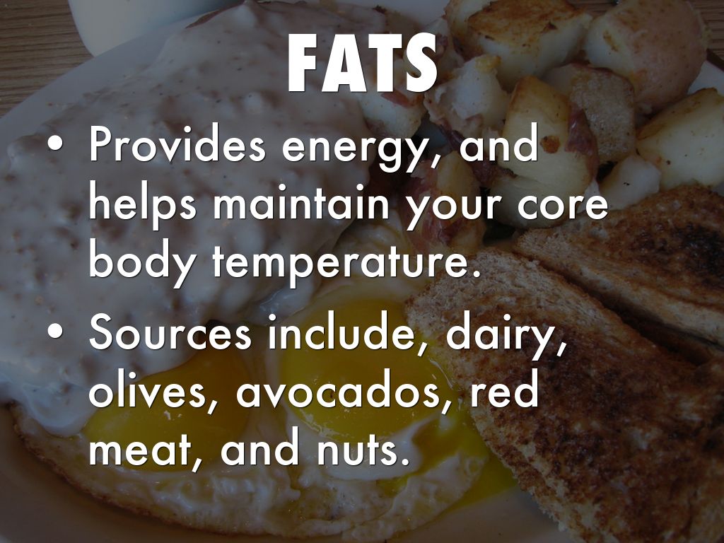 Sources include, dairy, olives, avocados, red meat, and nuts.