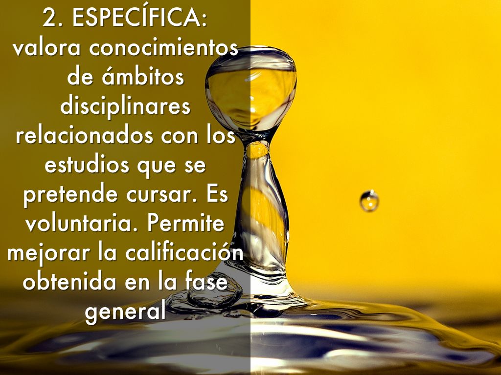 2. ESPECÍFICA: valora conocimientos de ámbitos disciplinares relacionados con los estudios que se pretende cursar. Es voluntaria. Permite mejorar la calificación obtenida en la fase general