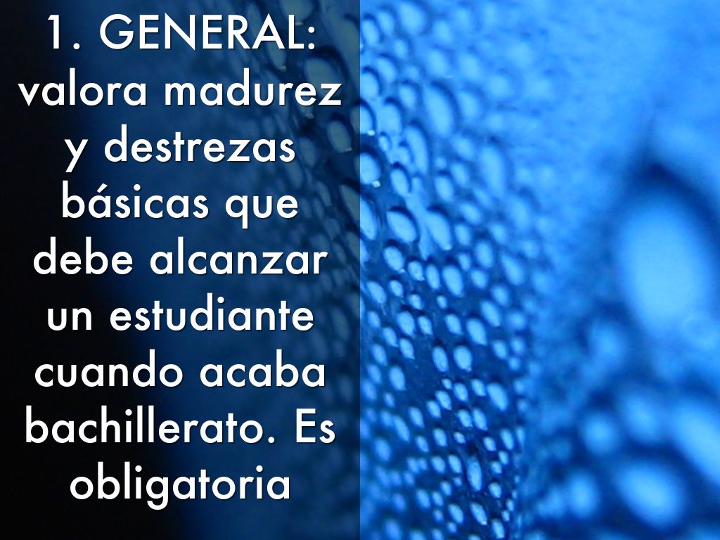 1. GENERAL: valora madurez y destrezas básicas que debe alcanzar un estudiante cuando acaba bachillerato. Es obligatoria