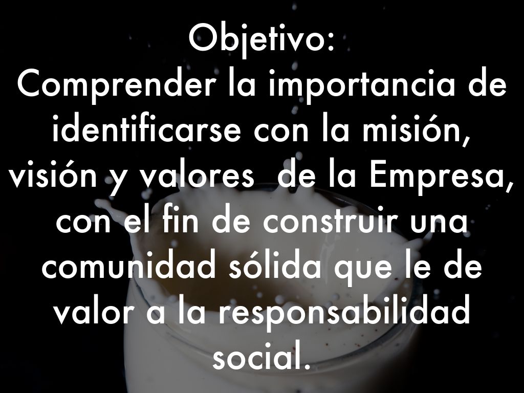 Objetivo: Comprender la importancia de identificarse con la misión, visión y valores de la Empresa, con el fin de construir una comunidad sólida que le de valor a la responsabilidad social.