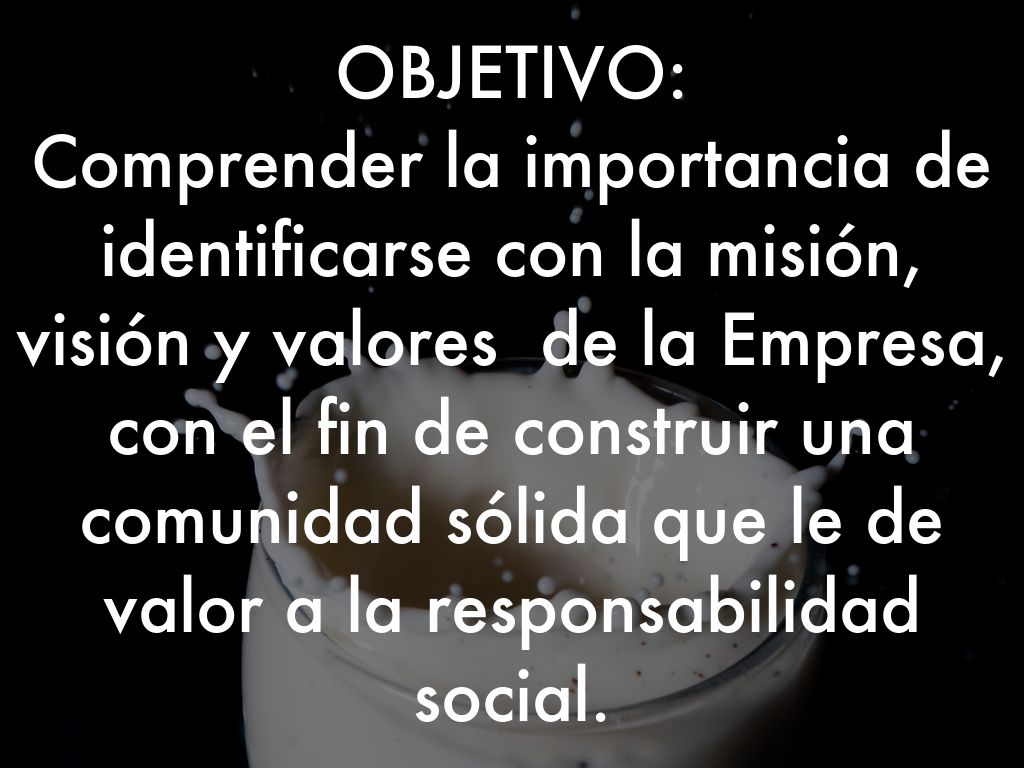 OBJETIVO: Comprender la importancia de identificarse con la misión, visión y valores de la Empresa, con el fin de construir una comunidad sólida que le de valor a la responsabilidad social.