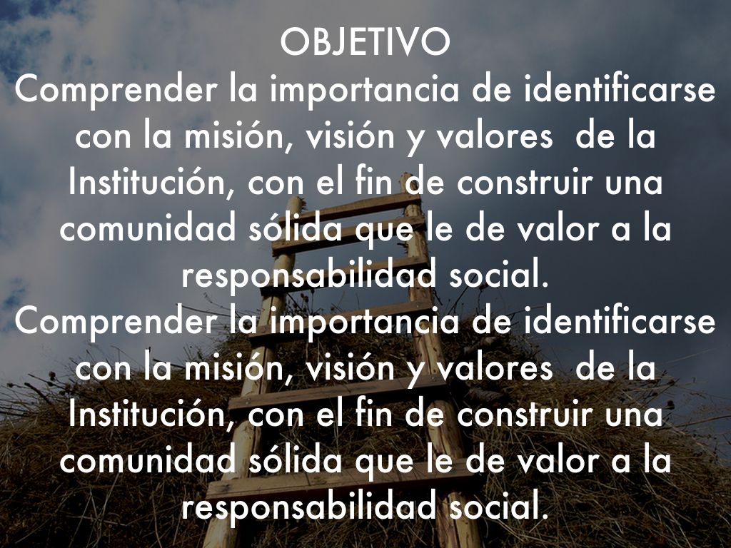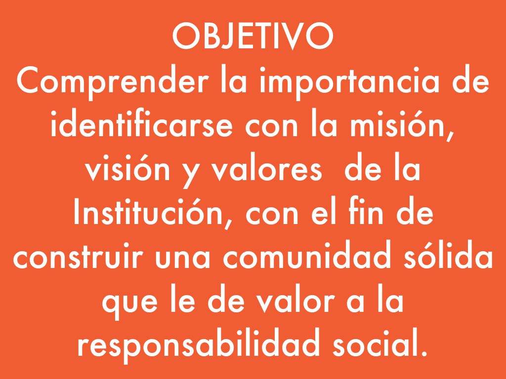 OBJETIVO Comprender la importancia de identificarse con la misión, visión y valores de la Institución, con el fin de construir una comunidad sólida que le de valor a la responsabilidad social. Comprender la importancia de identificarse con la misión, visión y valores de la Institución, con el fin de construir una comunidad sólida que le de valor a la responsabilidad social.