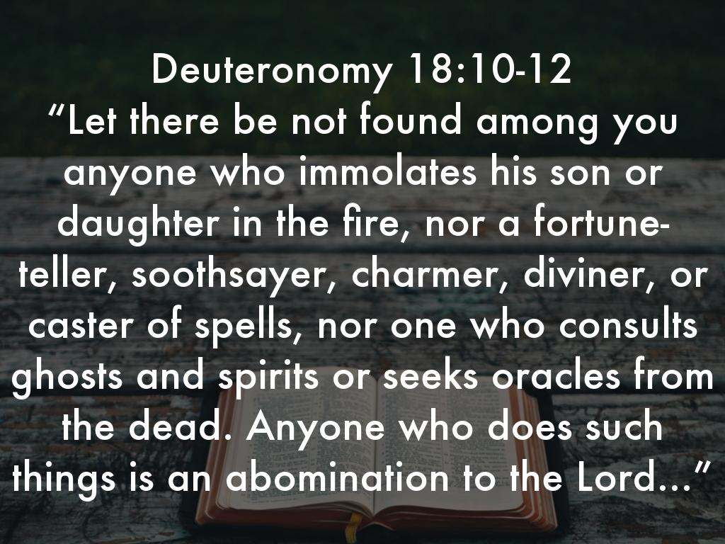 “Let there be not found among you anyone who immolates his son or daughter in the fire, nor a fortune-teller, soothsayer, charmer, diviner, or caster of spells, nor one who consults ghosts and spirits or seeks oracles from the dead. Anyone who does such things is an abomination to the Lord...”