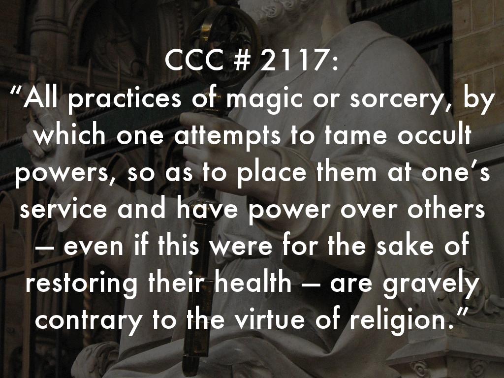 “All practices of magic or sorcery, by which one attempts to tame occult powers, so as to place them at one’s service and have power over others — even if this were for the sake of restoring their health — are gravely contrary to the virtue of religion.”