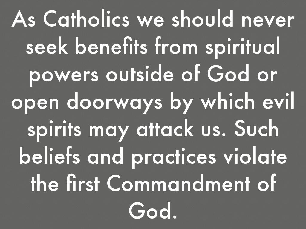 As Catholics we should never seek benefits from spiritual powers outside of God or open doorways by which evil spirits may attack us. Such beliefs and practices violate the first Commandment of God.