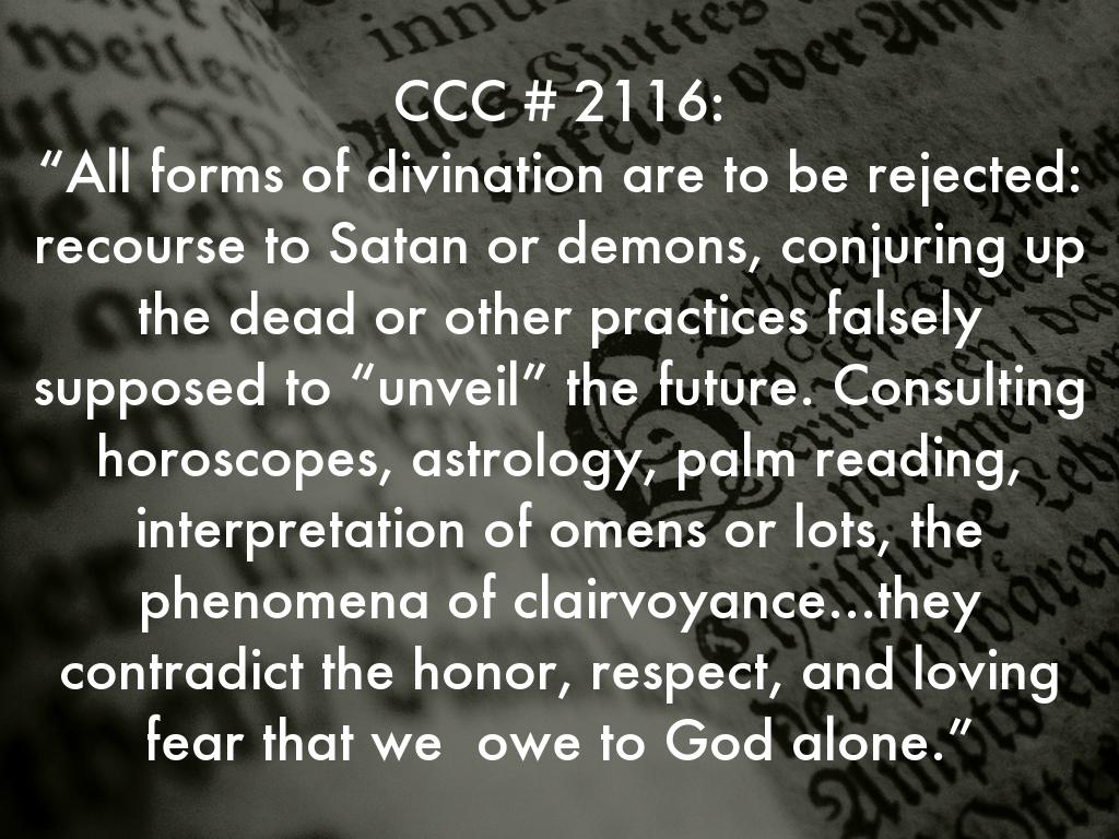 “All forms of divination are to be rejected: recourse to Satan or demons, conjuring up the dead or other practices falsely supposed to “unveil” the future. Consulting horoscopes, astrology, palm reading, interpretation of omens or lots, the phenomena of clairvoyance...they contradict the honor, respect, and loving fear that we owe to God alone.”